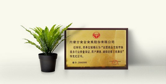 2006年3月中國保護消費者基金會,獎給內(nèi)蒙古食全食美股份有限公司。經(jīng)審核,確認(rèn)為:“全國商品交易市場服務(wù)行業(yè)質(zhì)量保證、用戶滿意、誠信經(jīng)營三優(yōu)單位”。
